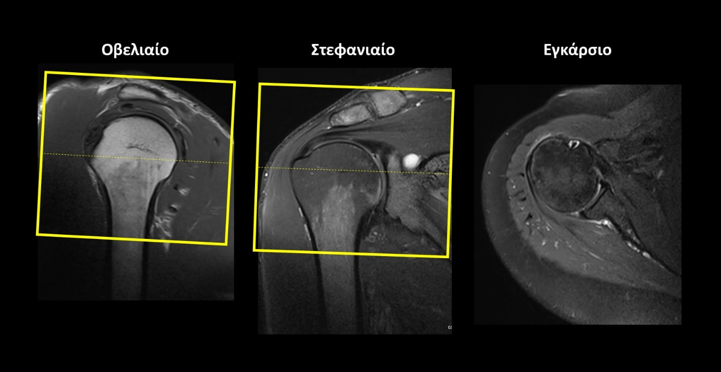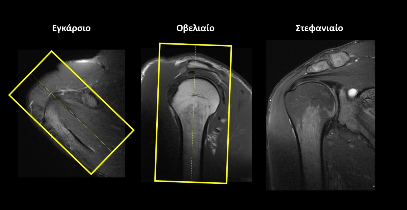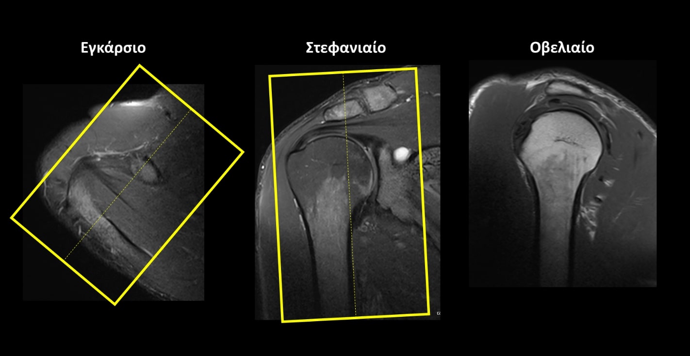 Στεφανιαίο (Coronal): οι στεφανιαίες τομές σχεδιάζονται παράλληλα με τον τένοντα του υπερακανθίου μυός στο εγκάρσιο επίπεδο και παράλληλα με το βραχιόνιο στο οβελιαίο επίπεδο. Οι τομές πρέπει να περιλαμβάνουν ολόκληρη την άρθρωση του ώμου, από την κορακοειδή απόφυση (μπροστά) έως το ακρώμιο (πίσω).