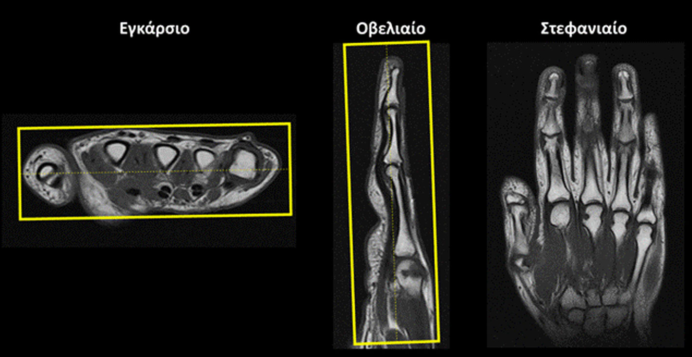 - Χρησιμοποιείται είτε το πηνίο του άκρας χειρός/καρπού (hand/wrist coil) είτε μικρό πηνίο flex είτε το πηνίο του γόνατος.