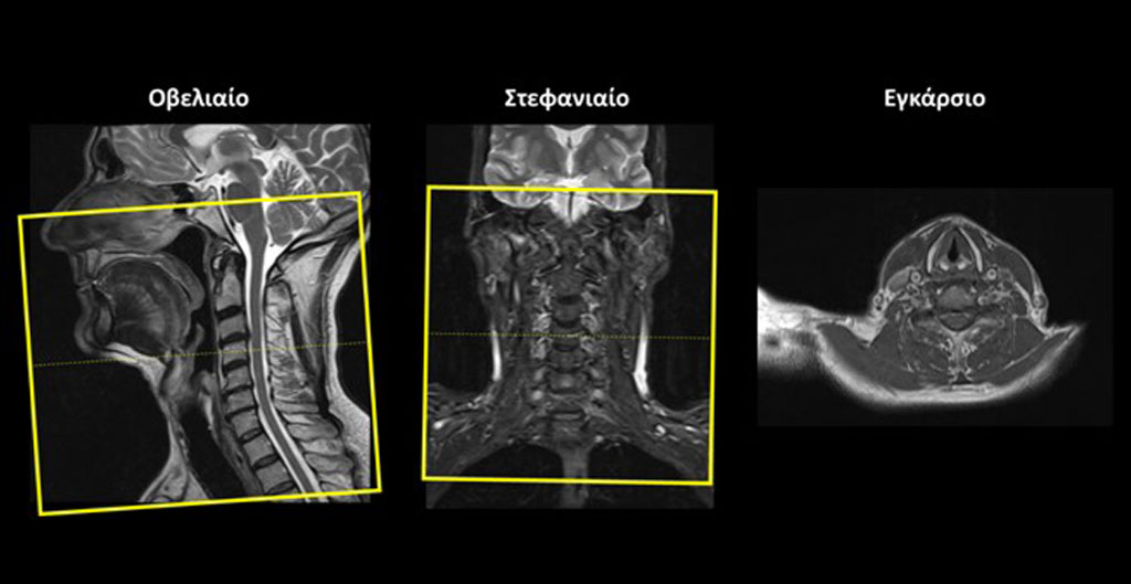- Τα σημαντικότερα επίπεδα στην Μαγνητική Τομογραφία τραχήλου είναι το εγκάρσιο και το στεφανιαίο. Παρόλα αυτό προτείνεται πάντα να λαμβάνεται μια ακολουθία T2-w (ή STIR) σε οβελιαίο επίπεδο. Το οβελιαίο επίπεδο είναι αρκετά χρήσιμο για την αξιολόγηση δομών όπως η γλώσσα, η υπερώα, ο ρινοφάρυγγας και η βάση του κρανίου.