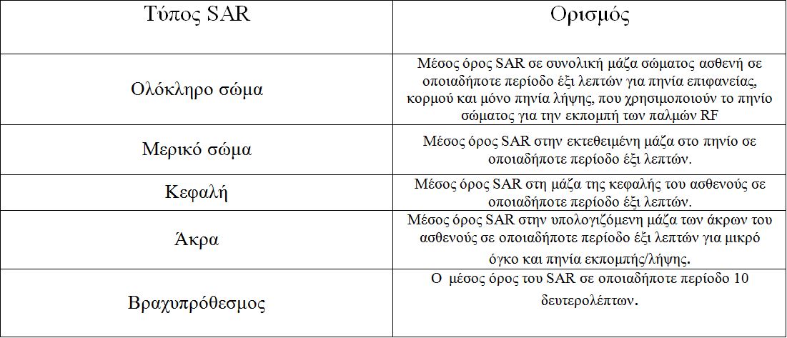 Ο SAR (specific absorption rate) είναι ρυθμός και παρέχει τη μέτρηση της ποσότητας της ισχύος RF που απορροφάται ανά μονάδα μάζας με μονάδα μέτρησης το watt ανά κιλό (W/kg). Με το ρυθμό αυτό μπορεί να μετρηθεί η ενέργεια των ραδιοσυχνοτήτων (RF) που απορροφάται από τους ιστούς. Οι Τύποι του SAR είναι οι εξής: