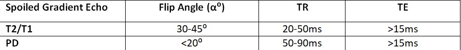 Οι ακολουθίες rewound GRE παρέχουν μια μίξη αντίθεσης Τ2/Τ1. Για την επίτευξη της ακολουθίας απαιτείται μικρός χρόνος TR (20-50ms) ώστε να διατηρείται η σταθερή κατάσταση. Ο χρόνος ΤΕ καθορίζει την ευαισθησία της ακολουθίας στις ανομοιογένειες του πεδίου και τις επιδράσεις Τ2*. Η γωνία πρόσπτωσης (α) καθορίζει το βαθμό μίξης της εγκάρσιας (Τ2) και διαμήκους (Τ1) μαγνήτισης. Για μικρές γωνιές πρόσπτωσης (<20⁰) δεν επιτυγχάνεται σταθερή κατάσταση καθώς η διαμήκης μαγνήτιση δεν αλλάζει αρκετά, με αποτέλεσμα να έχουμε βάρος εικόνας πρωτονίων (PDW). Για μεγάλες γωνιές πρόσπτωσης (α>30⁰) έχουμε ανταλλαγή μεταξύ της εγκάρσιας και διαμήκους συνιστώσας και το συνολικό σήμα εξαρτάται τόσο από τον Τ2 όσο και από τον Τ1 χρόνο χαλάρωσης.